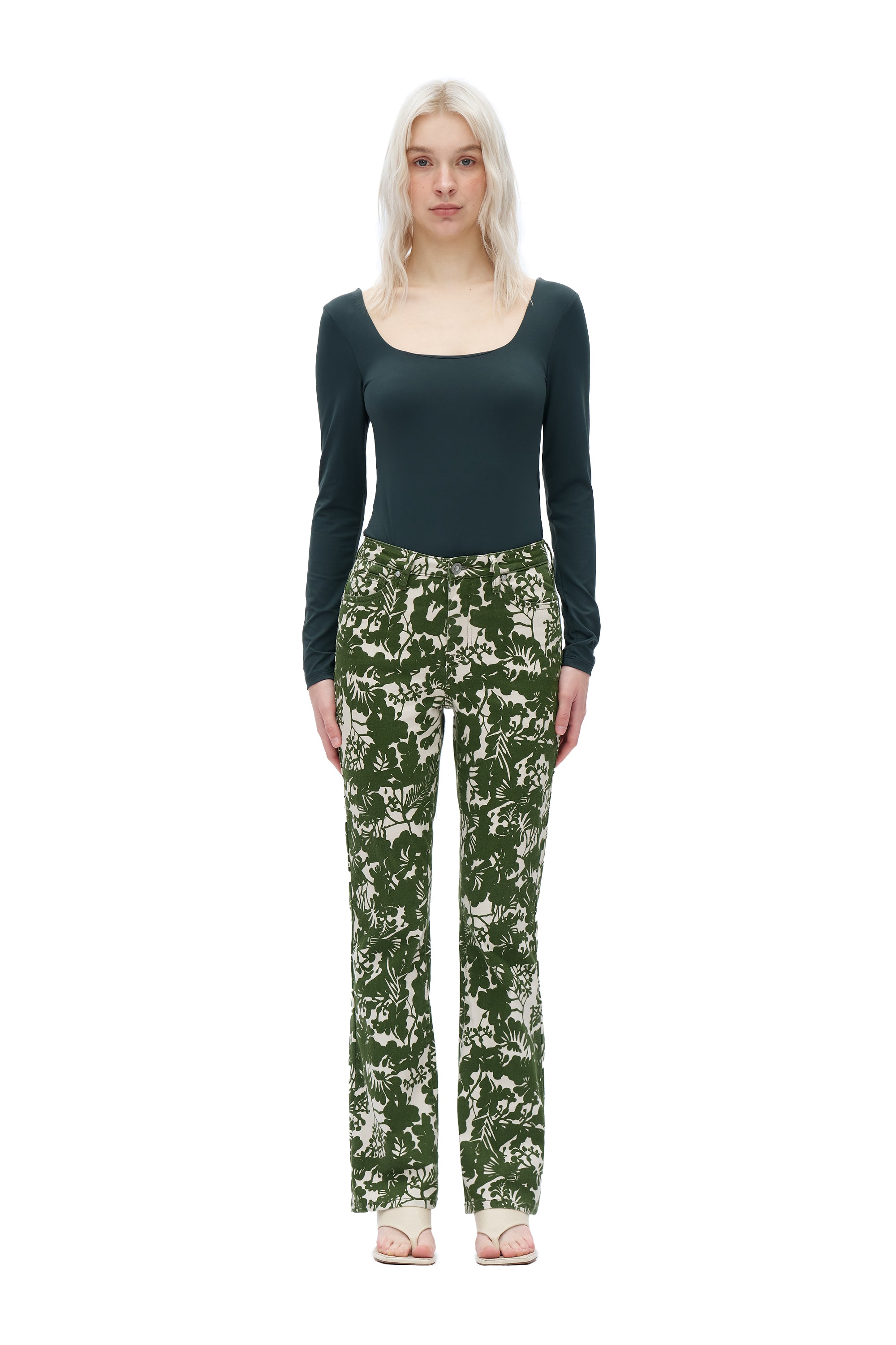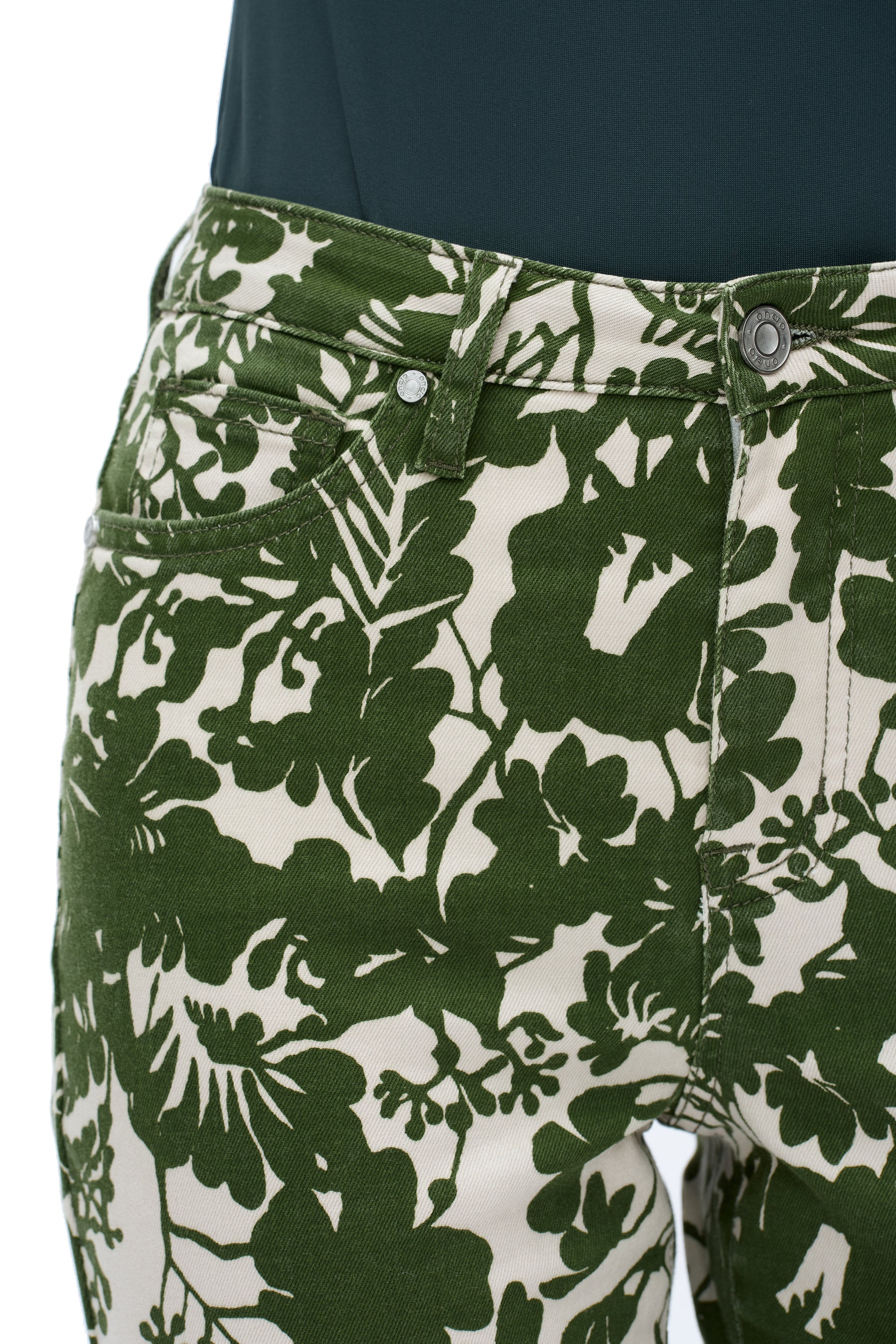 Artisan high-rise bootcut jeans with tropical floral print, five-pocket styling, and comfort stretch for a statuesque, leg-lengthening silhouette and coastal-chic elegance.