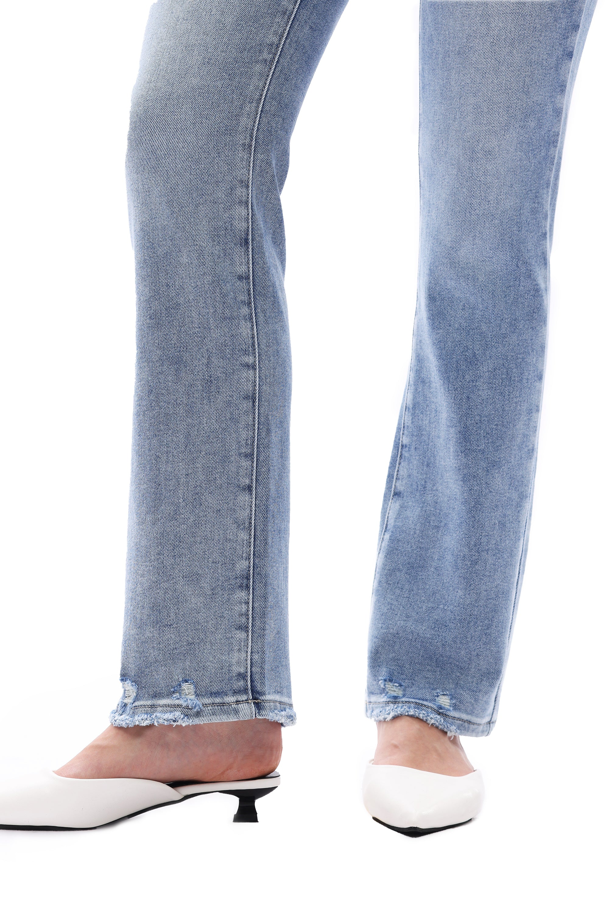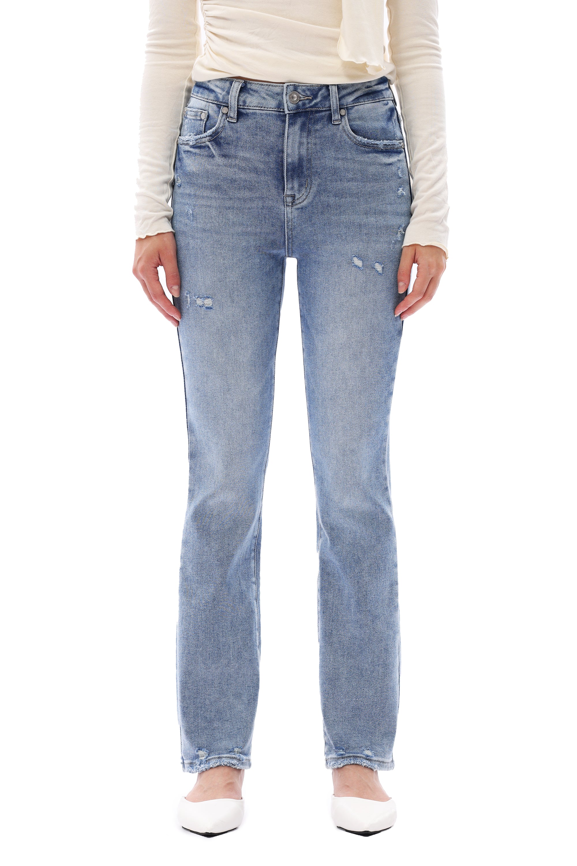 High-rise straight jeans with subtle whiskered fading and five-pocket styling, crafted with comfort stretch for a sleek, leg-lengthening fit—perfect for timeless 90s nostalgia.