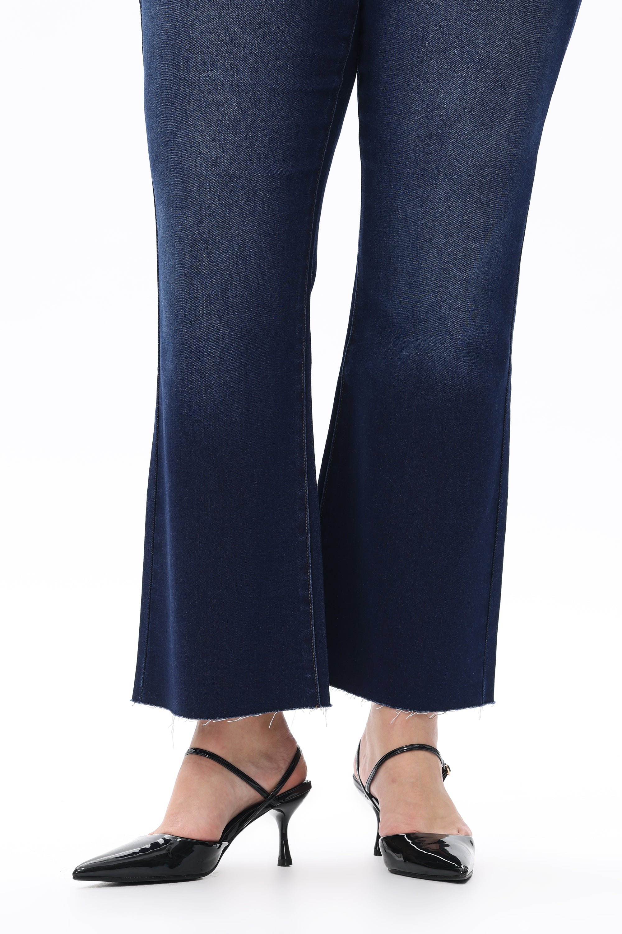 High-rise bootcut jeans in a rich dark blue wash, featuring raw frayed hems and comfort stretch to sculpt a clean, leg-lengthening silhouette with modern Western and retro-chic appeal.