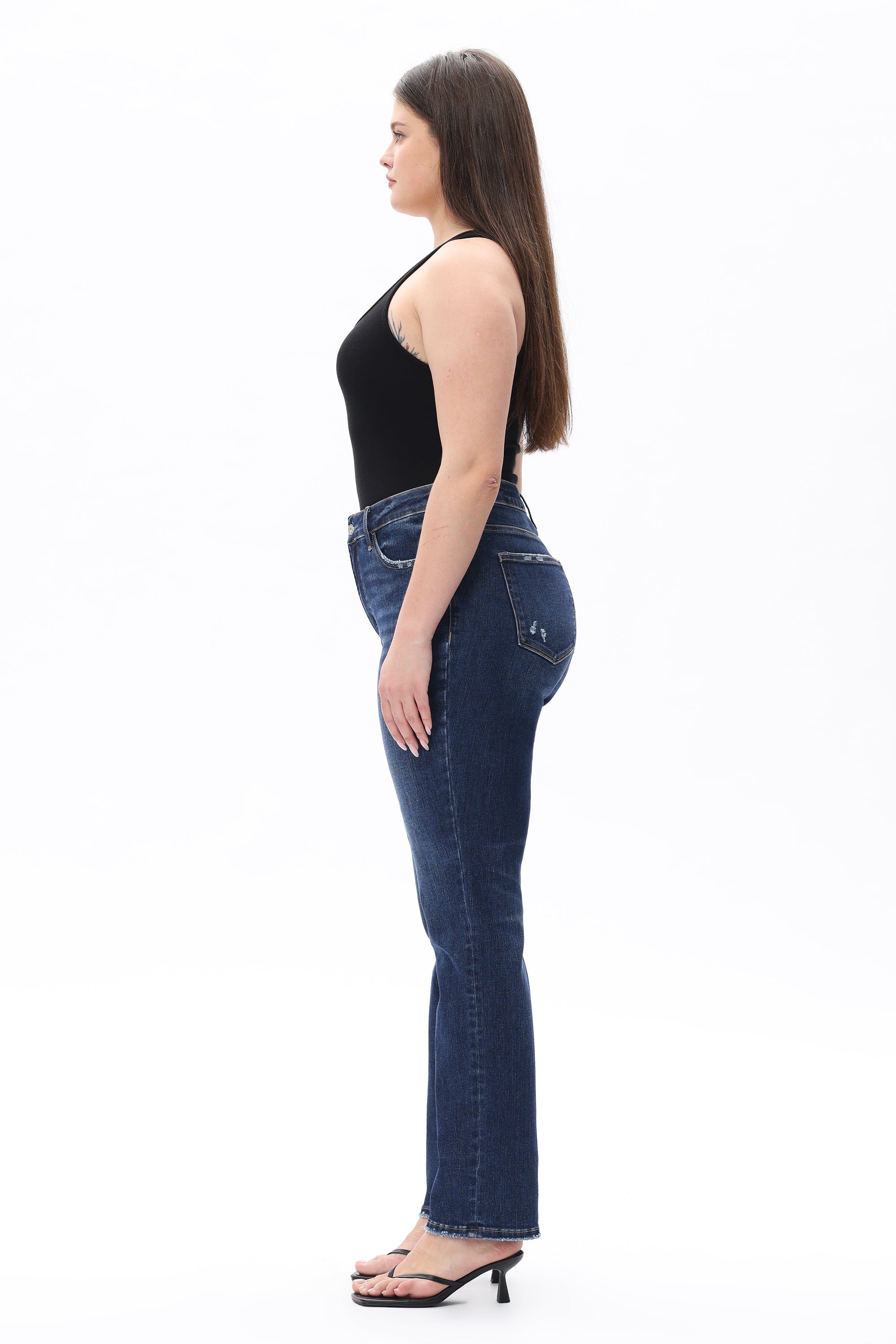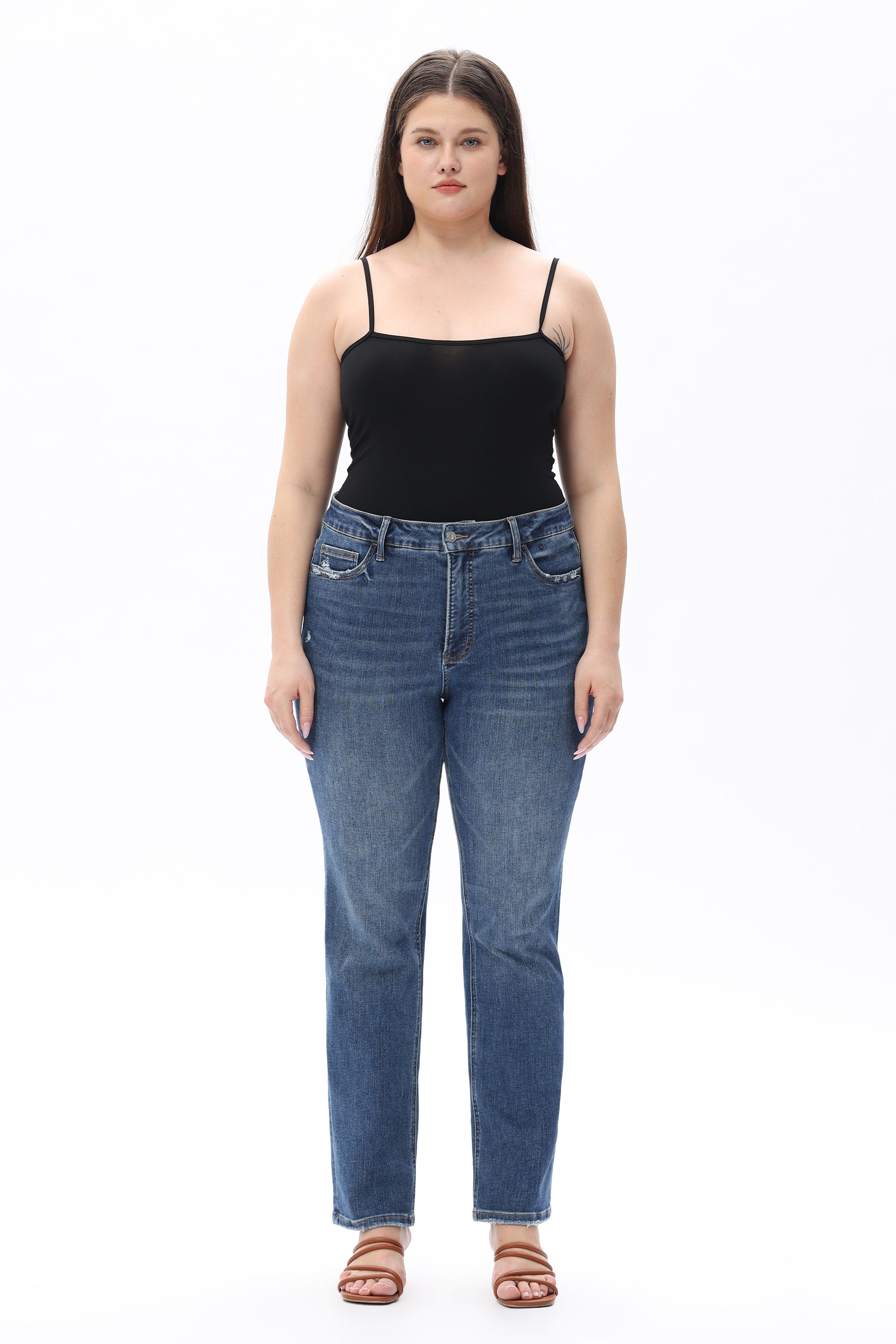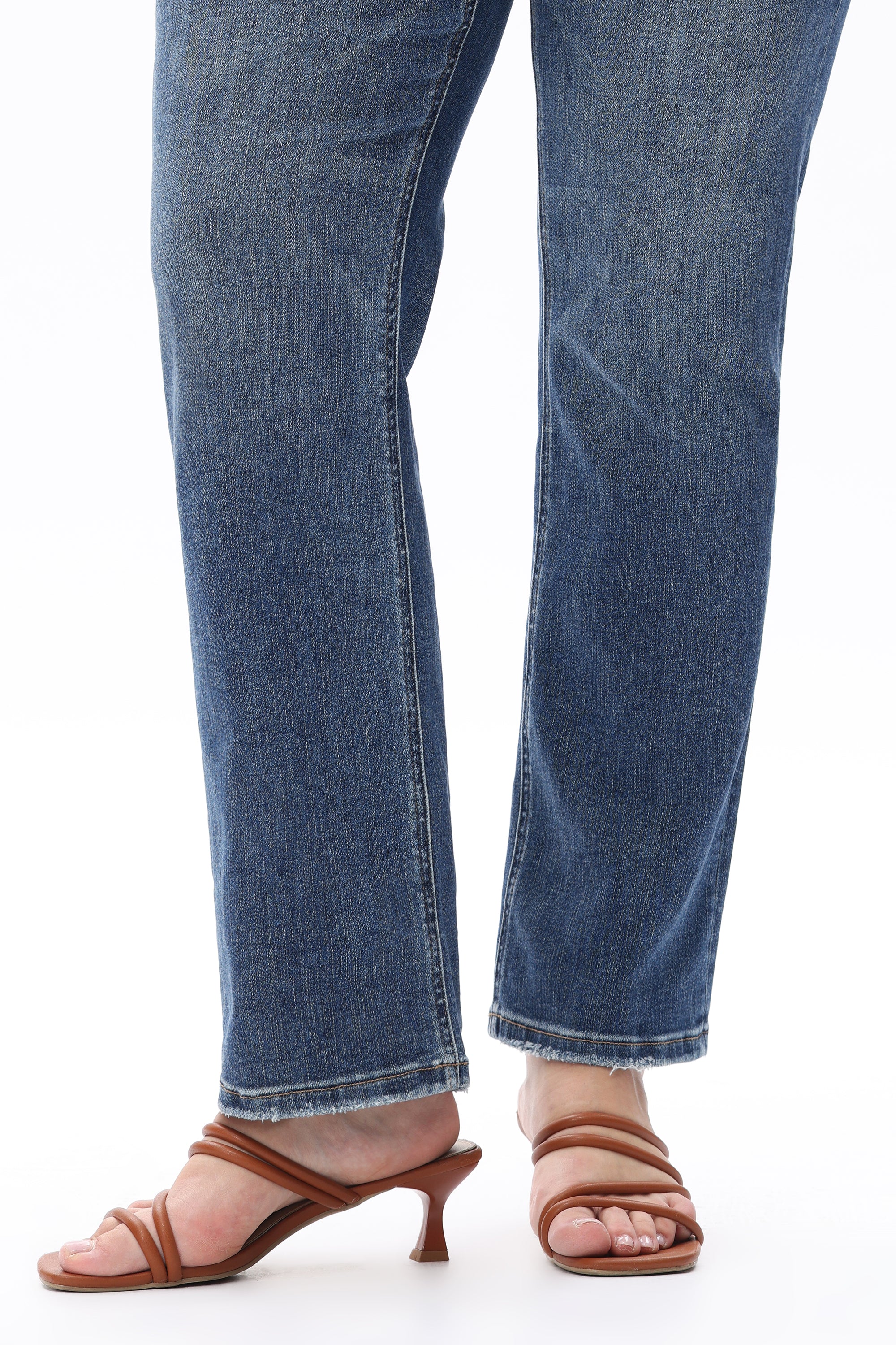 Heritage-inspired mid-rise straight jeans with subtle hand-sanded fading, classic five-pocket styling, and comfort stretch—designed for a clean, streamlined silhouette with effortless 90s appeal.
