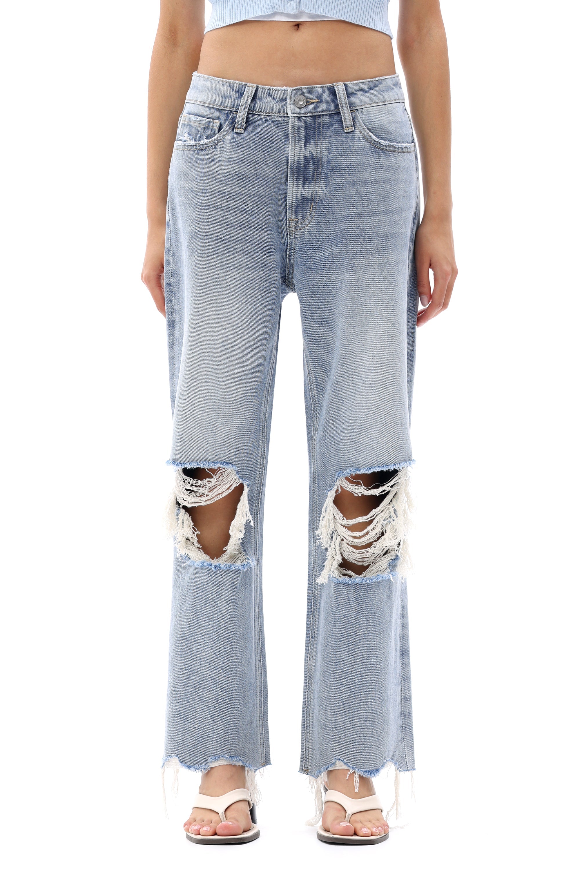 Light blue high-rise cropped straight-leg jeans with distressed knees & frayed hem deliver raw street-style edge—crafted from durable non-stretch denim for structured comfort, finished with classic five-pocket design and zipper closure, versatile for casual/statement looks.